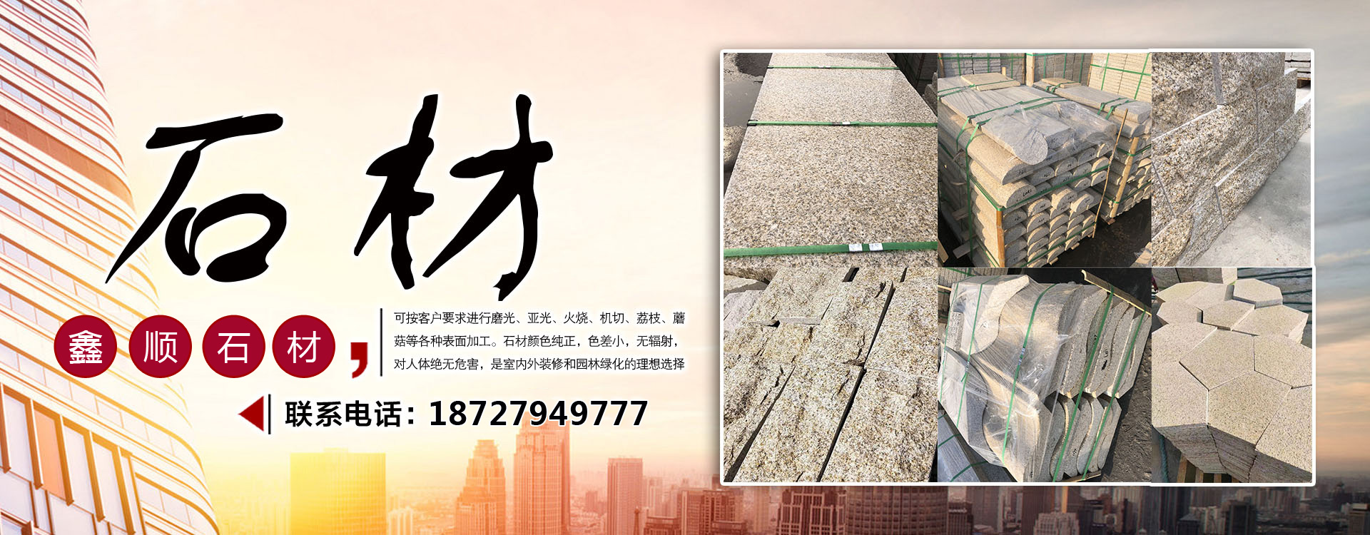 隨州市鑫順石材有限公司位于湖北省隨州市隨縣萬和鎮(zhèn)桐柏山。是一家集礦山開采、石材加工、異形制作、產(chǎn)品銷售為一體的大型綜合型石材企業(yè)!本公司主要經(jīng)營:中花白麻,小花白麻,黃金麻,黃金鉆,芝麻灰,鐘山青,芝麻黑,泌陽紅,各類異形石材。生產(chǎn)的石材規(guī)格齊全、做工精細(xì),被廣泛用于外墻干掛、廣場地鋪、市政園林、建筑工程、環(huán)境景觀異形石材等各類建筑墻體、地面的裝飾裝修。公司專注于石材行業(yè)多年,生產(chǎn)優(yōu)質(zhì)的無色差優(yōu)質(zhì)白麻,永不吐銹量大,穩(wěn)定,主攻高鐵站,地鐵站,機場等大型市政房產(chǎn)??沙薪痈鞣N異形加工,速度快,質(zhì)量無憂。我們秉承“誠信經(jīng)營,服務(wù)為本”的經(jīng)營理念,竭誠為廣大客戶提供優(yōu)質(zhì)的產(chǎn)品和滿意服務(wù),期待與您的合作,竭誠歡迎國內(nèi)外新老客戶前來訂購洽談!